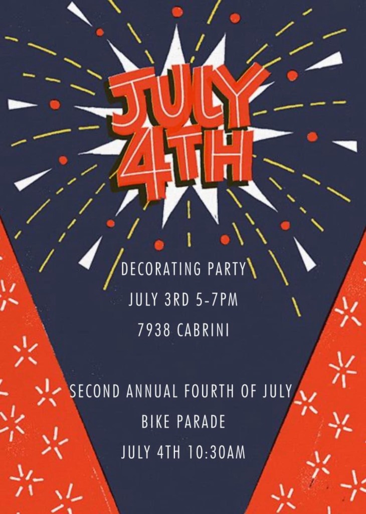 Then show off your patriotic wheels in the second annual bike parade! Start at 7938 Cabrini Dr at 10:30 am on July 4 and make a full loop.